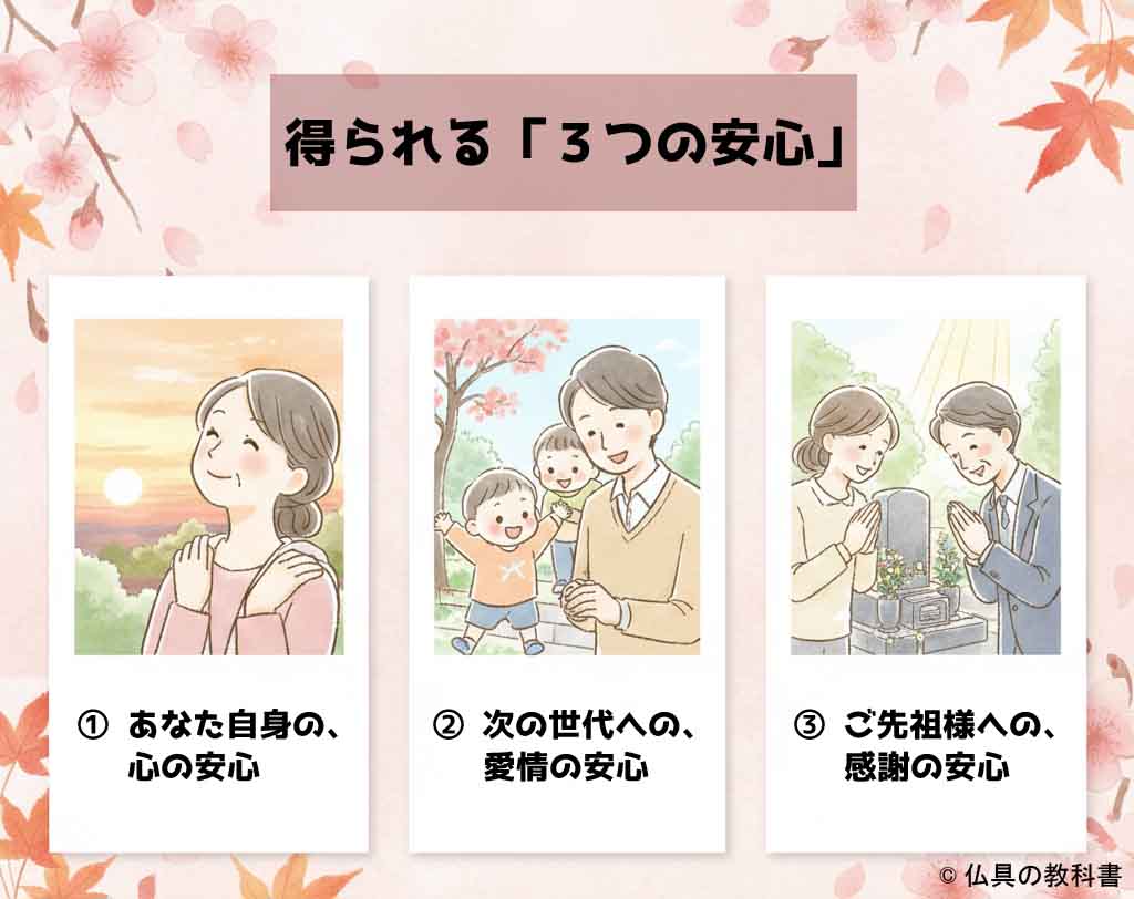 「墓じまい」や「仏壇じまい」は、決して寂しい作業ではありません。それは、未来に向けた「3つの安心」を手に入れるための、前向きな営みなのです。