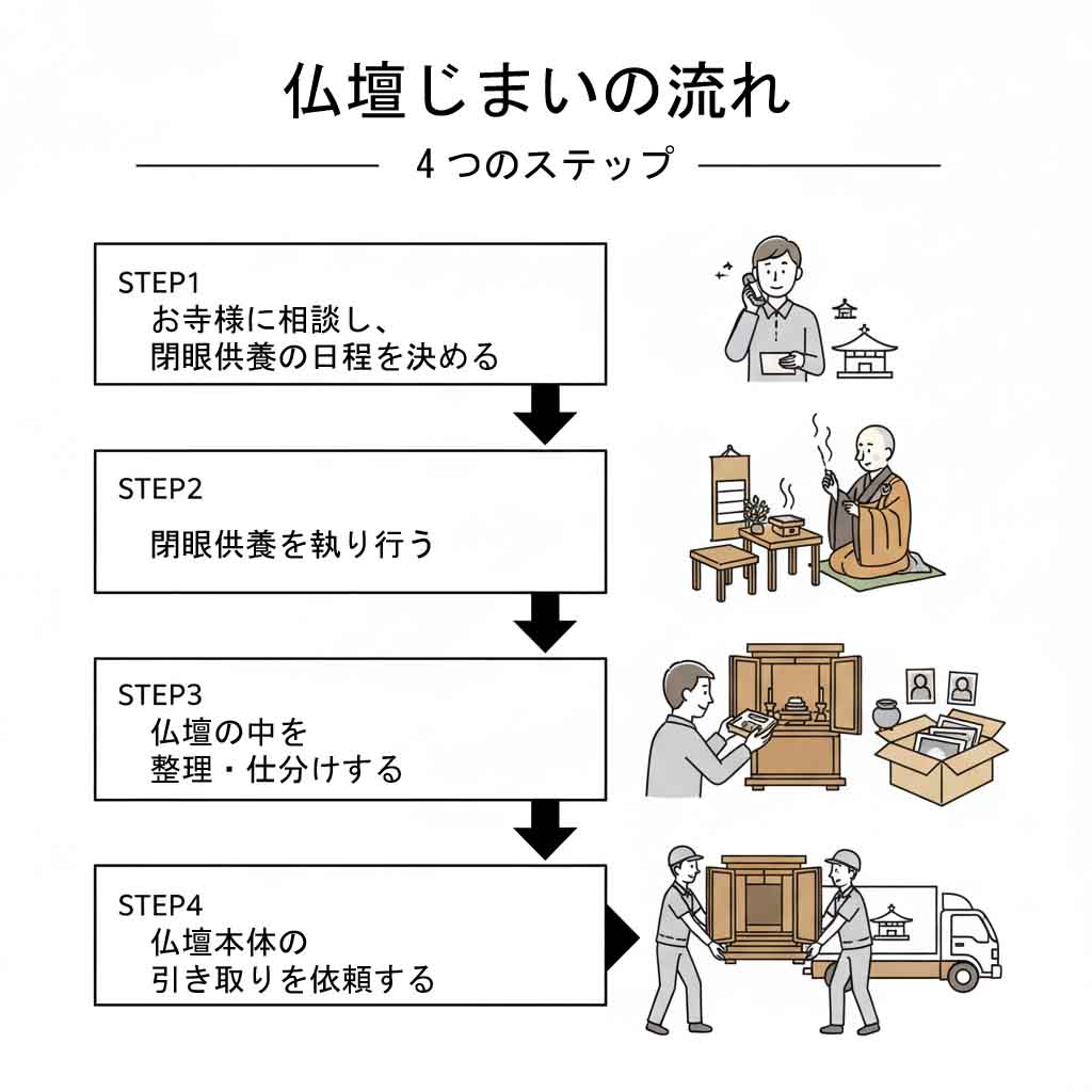 仏壇じまいの基本的な流れは、以下の4つのステップで進みます。