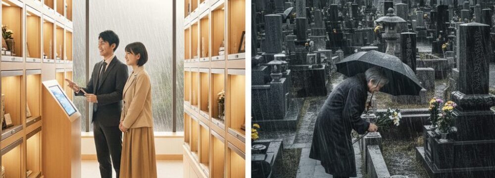 天候に左右されず、快適にお参りできる | お墓参りらしい風情(屋外の開放感など)は少ない |